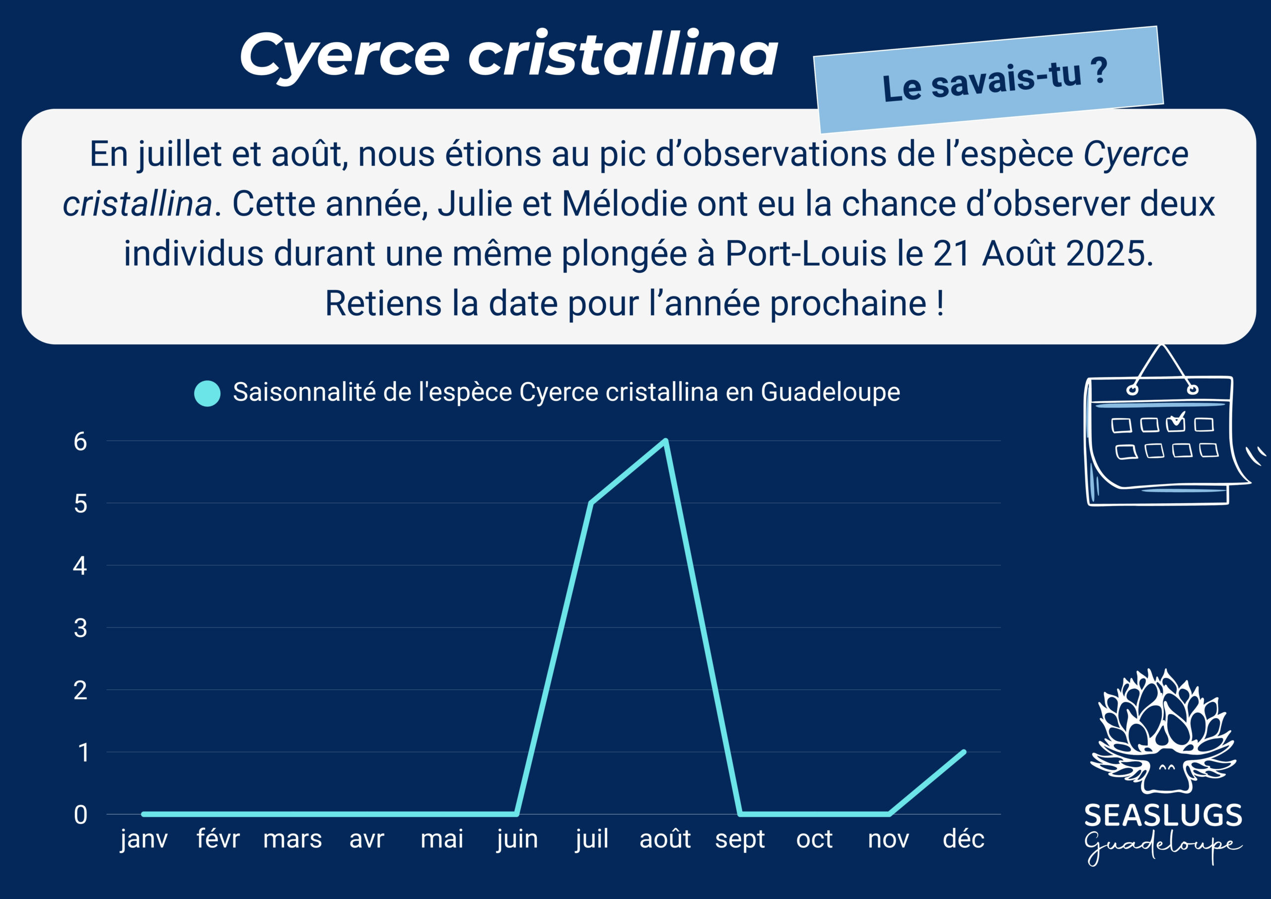 L’été, c’est la saison des Cyerce cristallina et nous avons réussi à en voir encore cette année ! Pour information, les observations des mois de Juillet et d’Août sont uniquement à Port-Louis alors que l’unique de Décembre est à Marie-Galante🧐